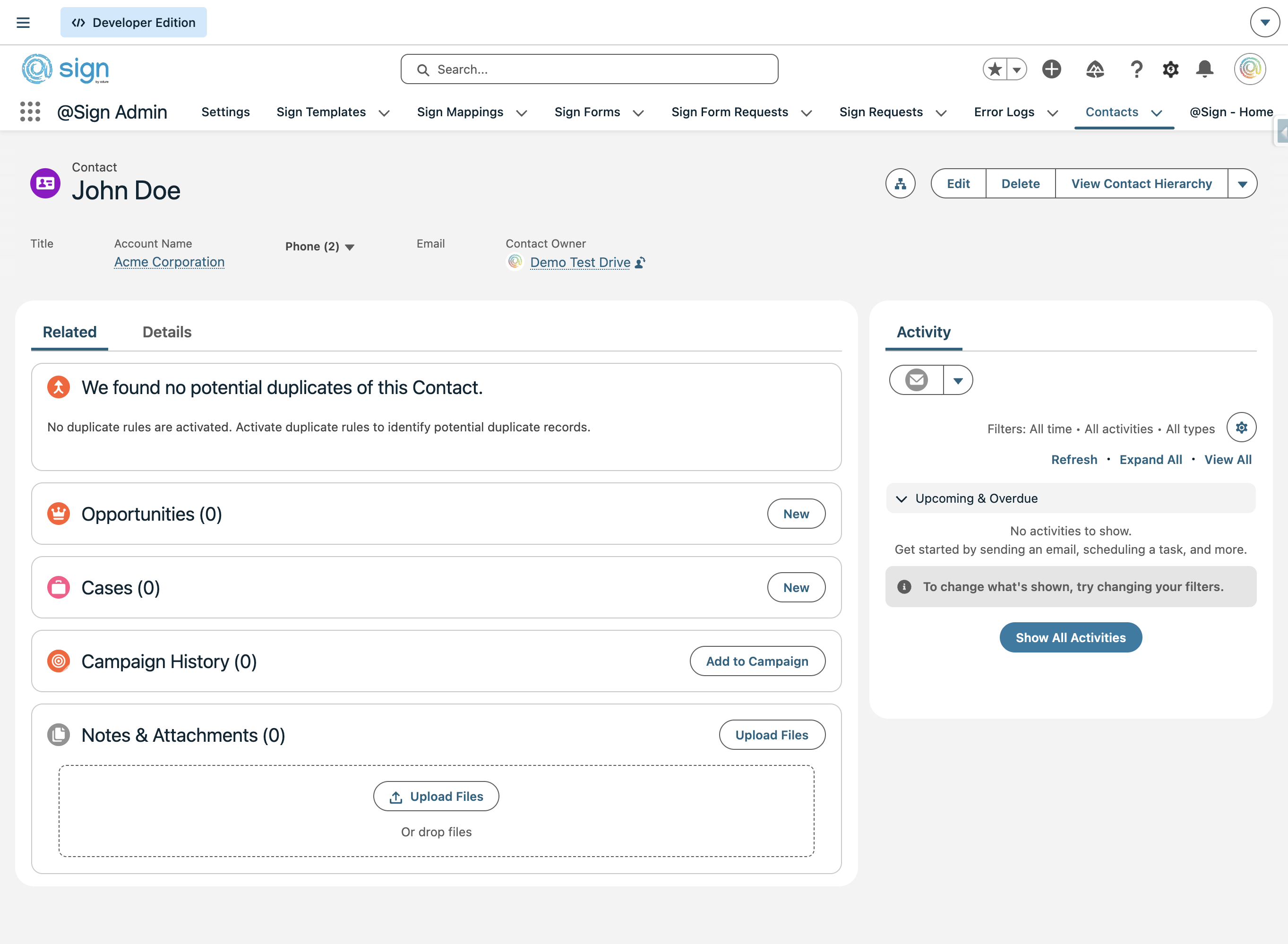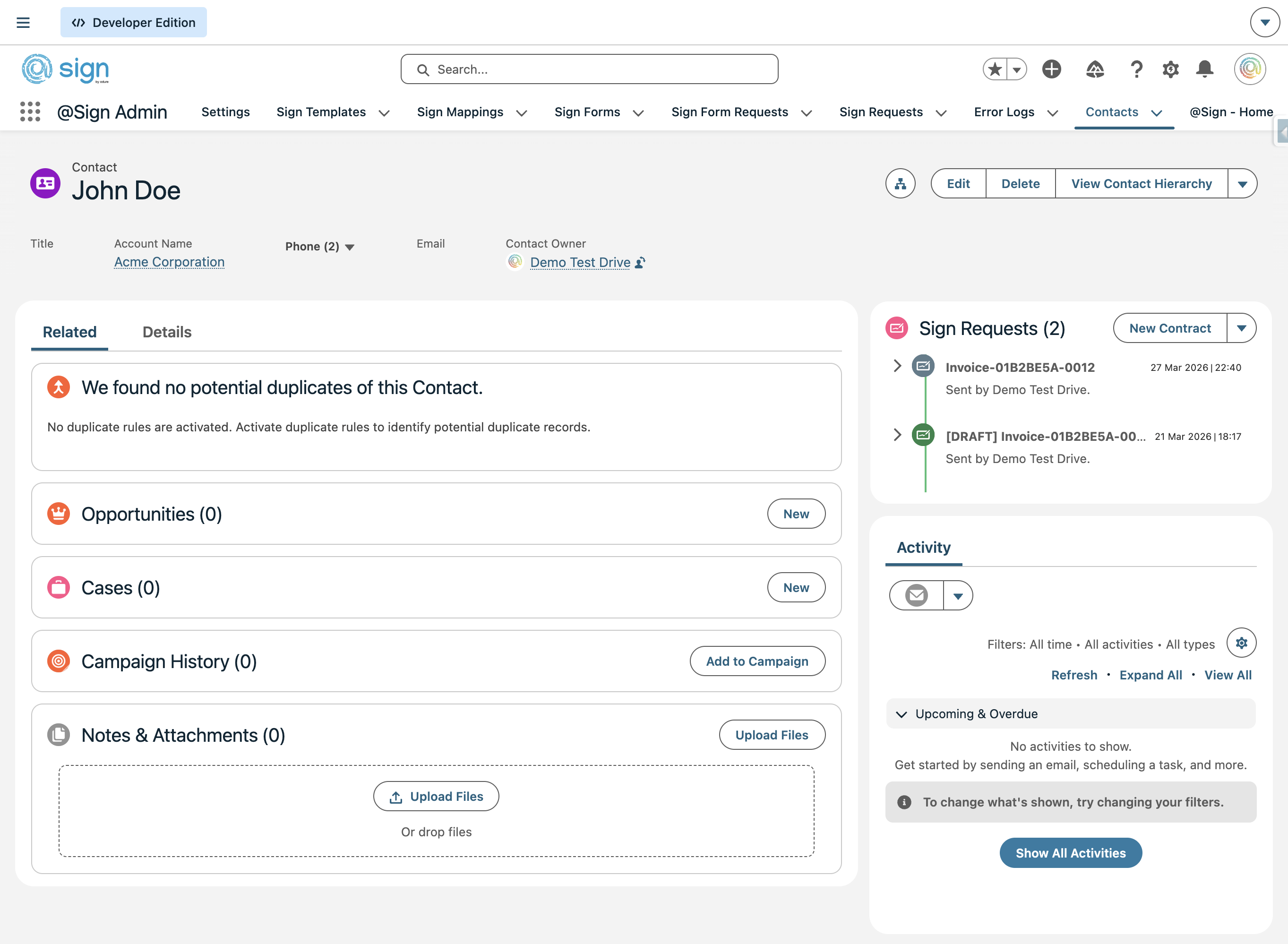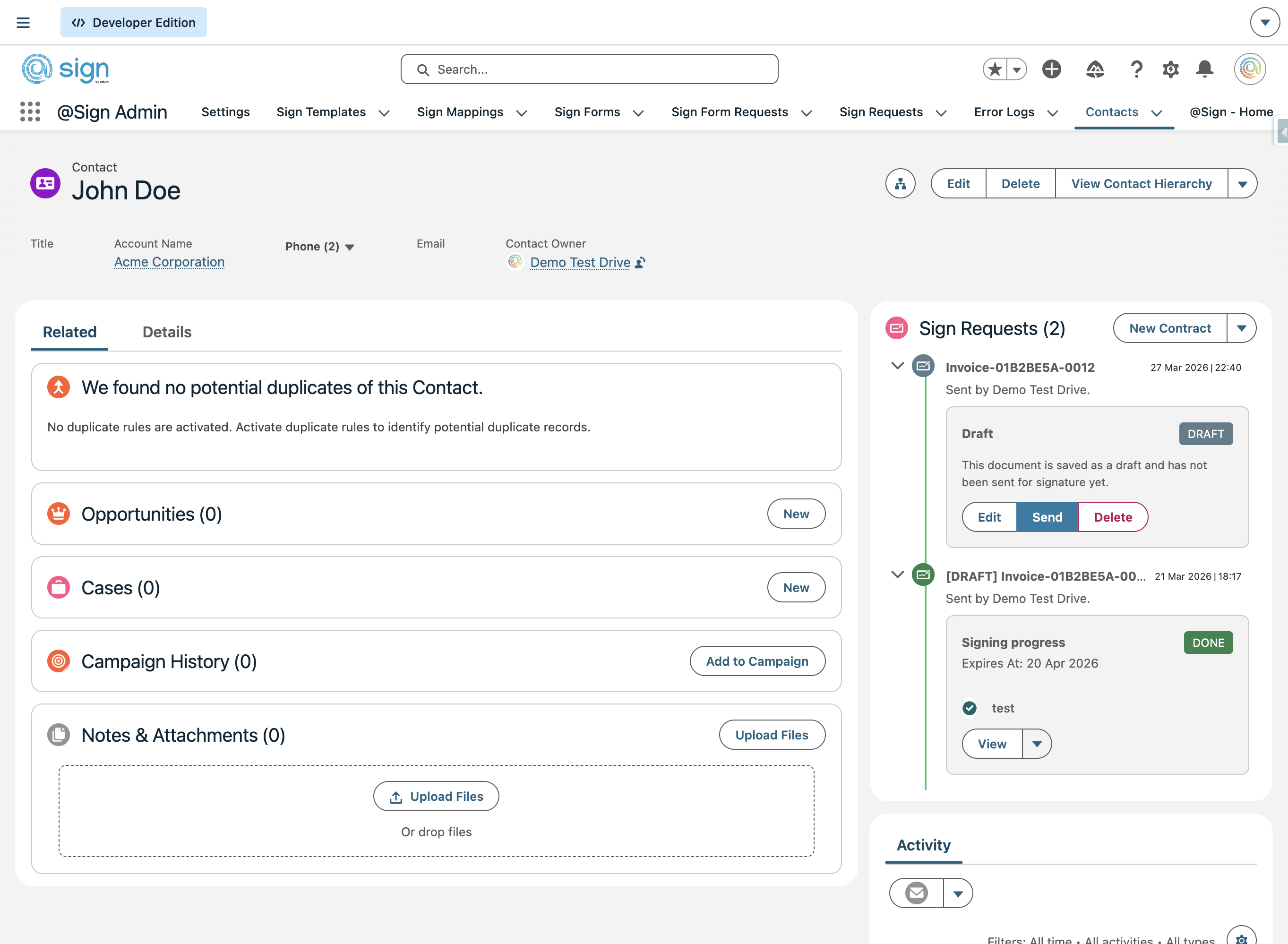 The Lightning Web Component (LWC) is the primary interface for your Salesforce users. By placing the @Sign – Overview component on your record pages (Leads, Accounts, Opportunities, etc.), you provide your team with a centralized hub to send documents, track real-time signature progress, and access signed files without leaving the record.