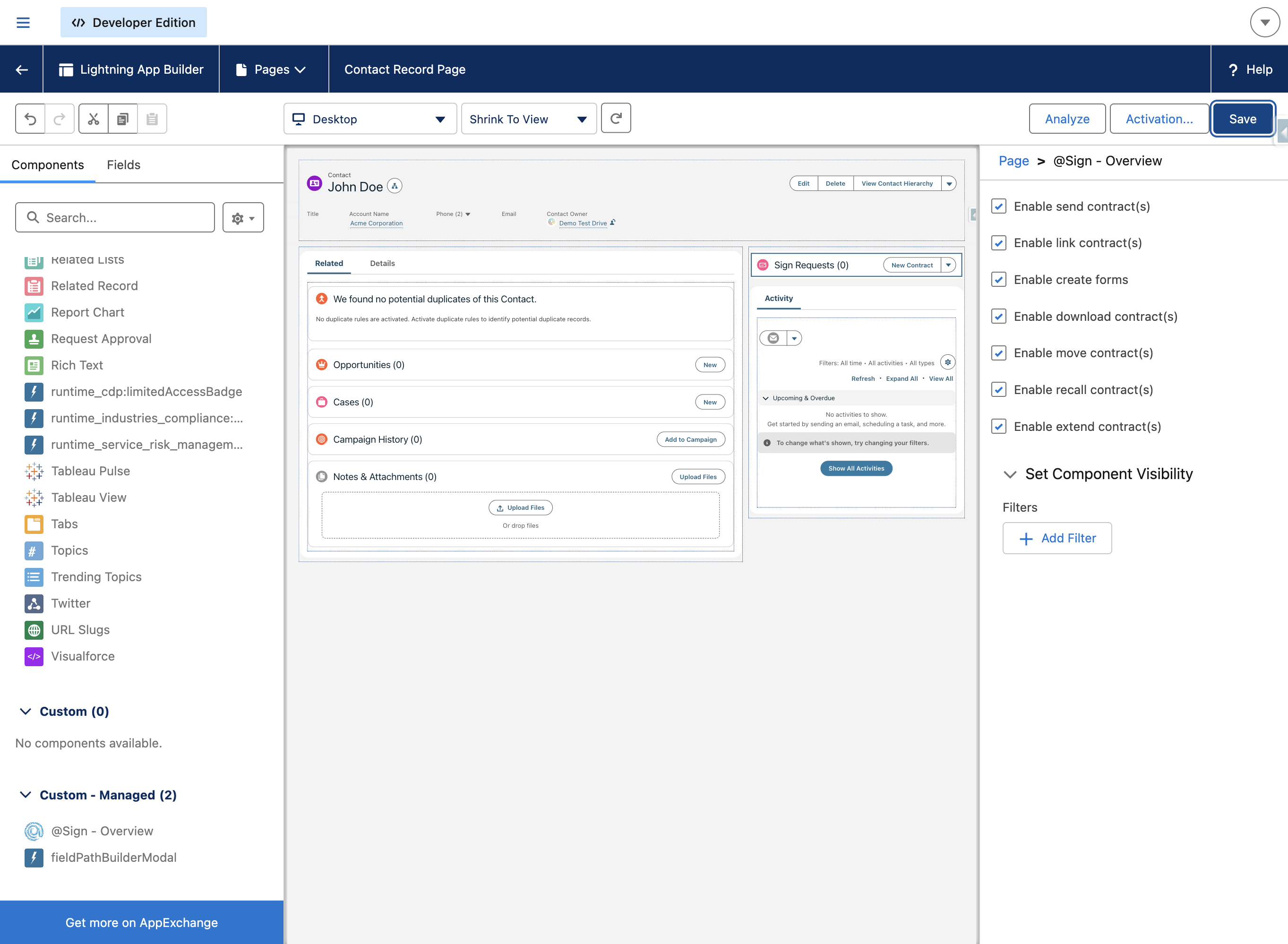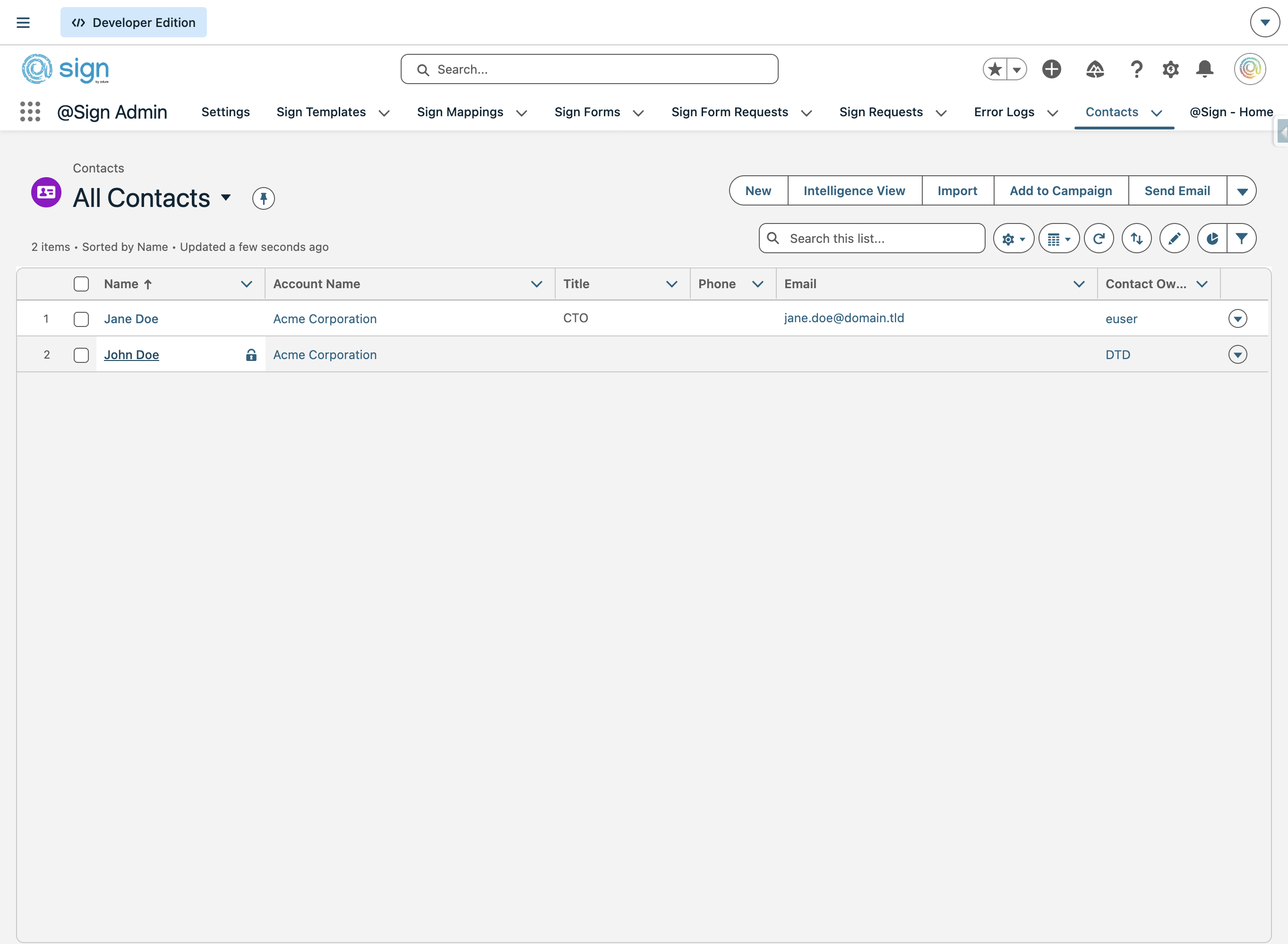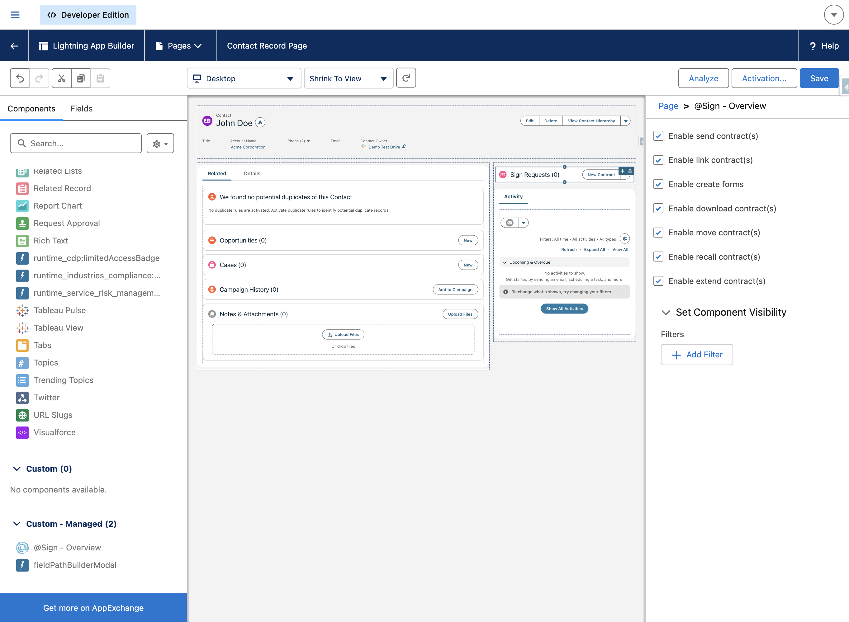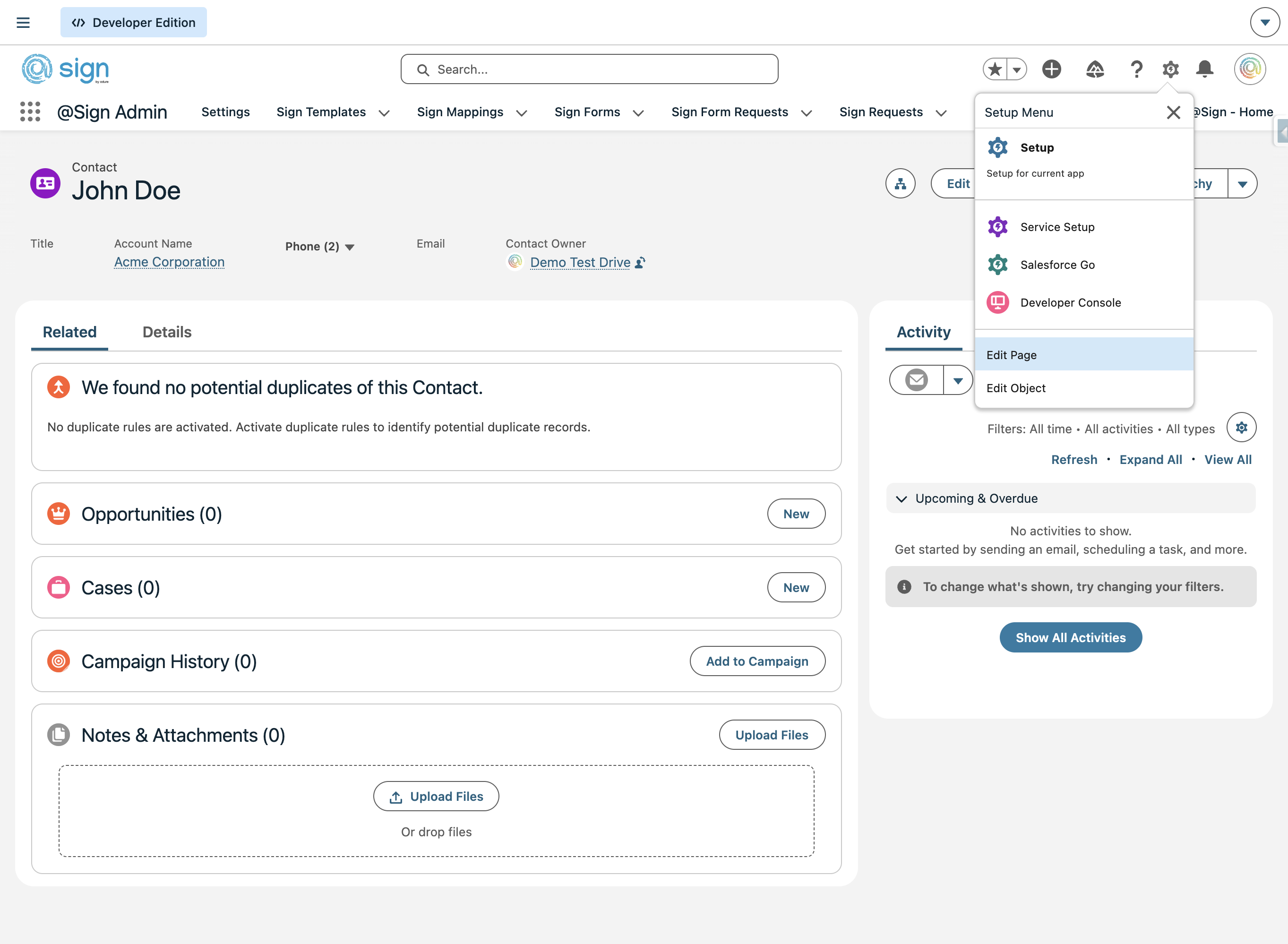 The Lightning Web Component (LWC) is the primary interface for your Salesforce users. By placing the @Sign – Overview component on your record pages (Leads, Accounts, Opportunities, etc.), you provide your team with a centralized hub to send documents, track real-time signature progress, and access signed files without leaving the record.