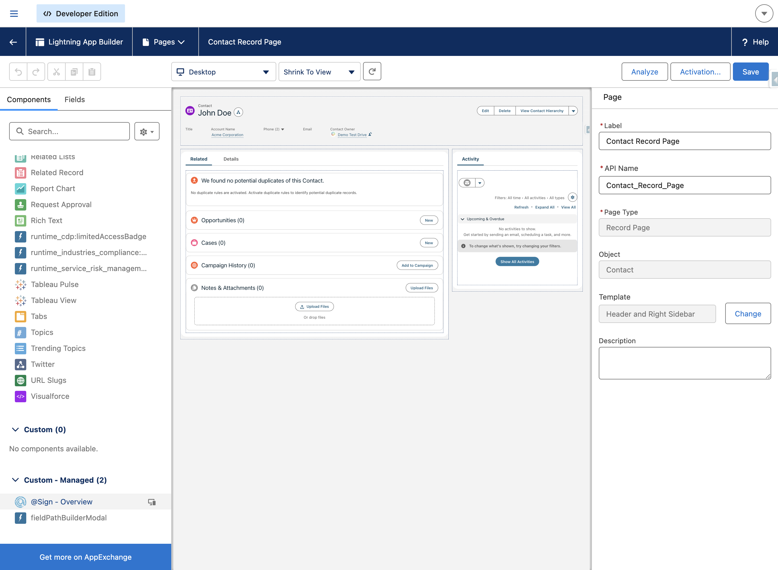 Navigate to a record page of the object type where you want to install the component on. In this example we will use Contact. We open the object detail page of "Jane Doe".