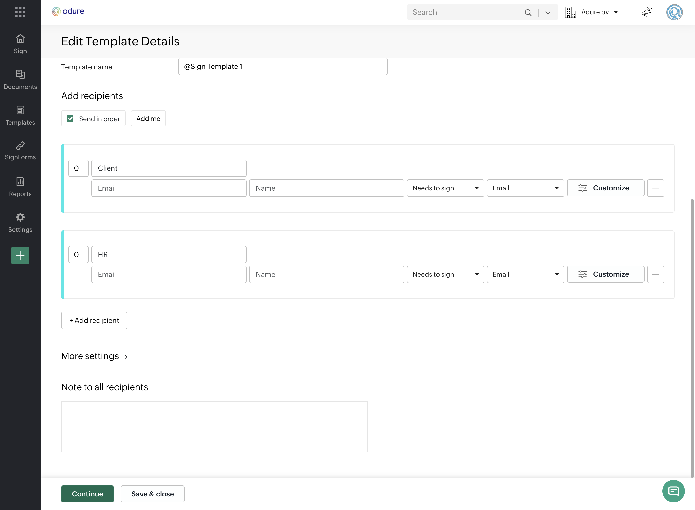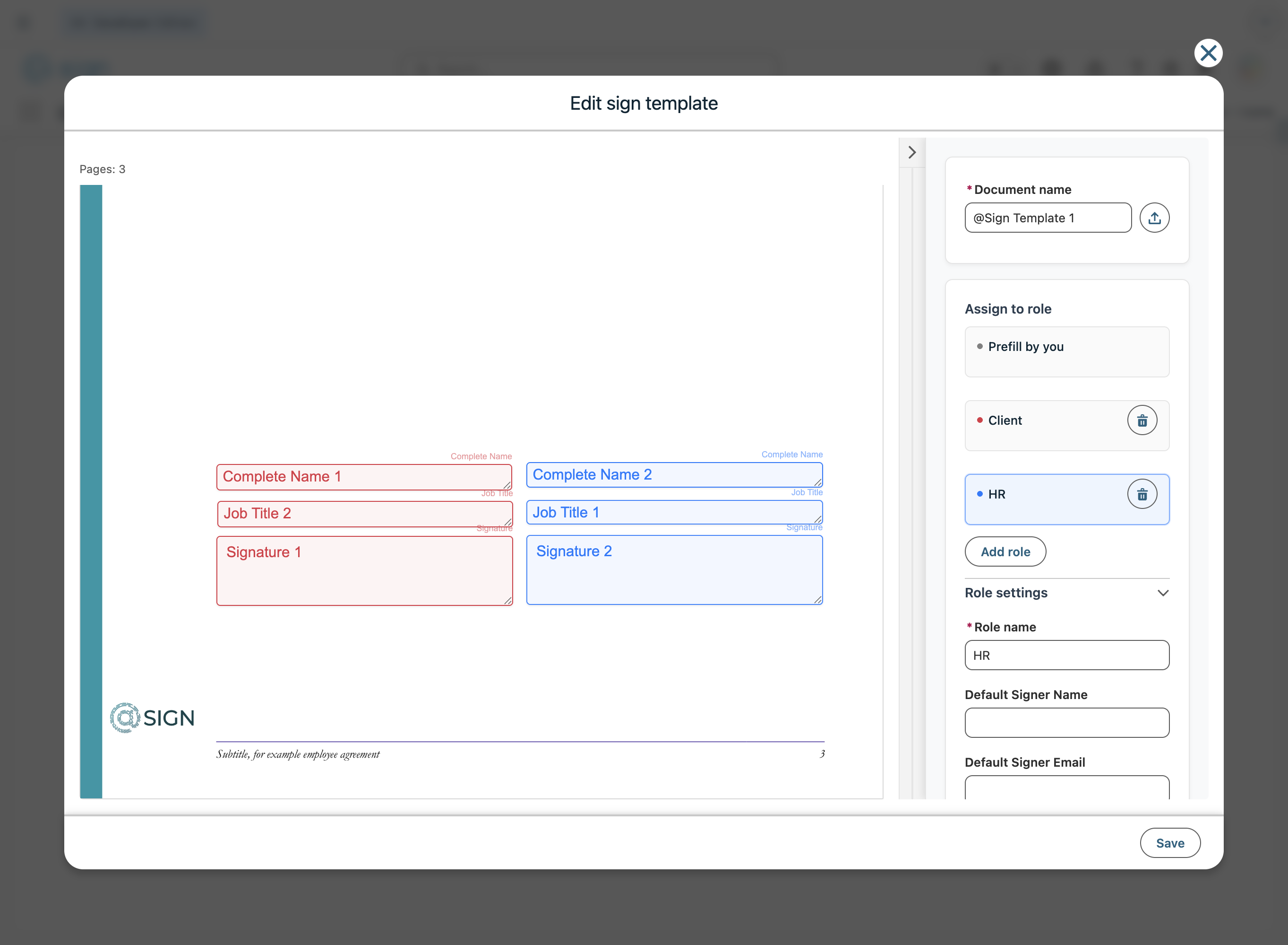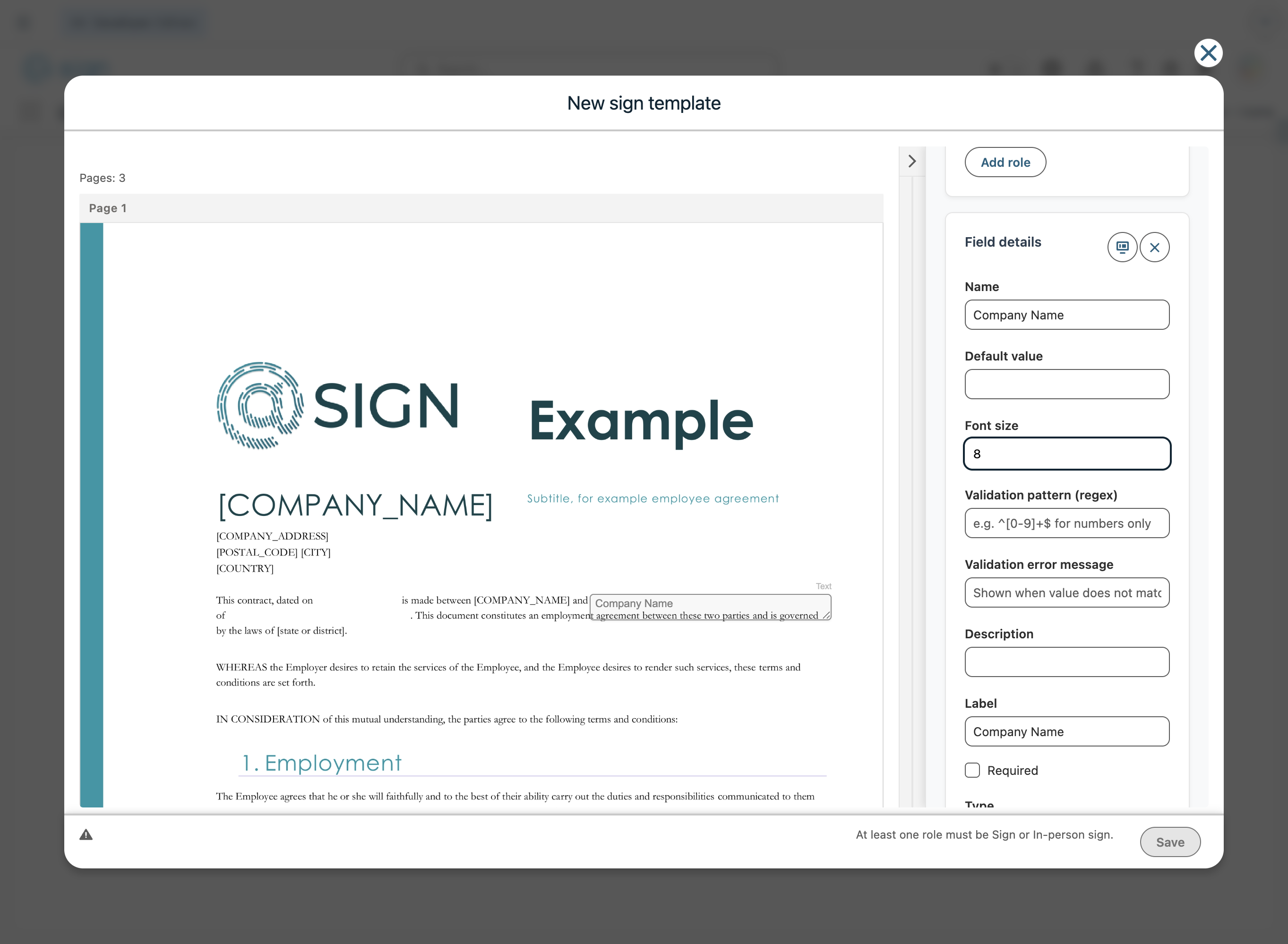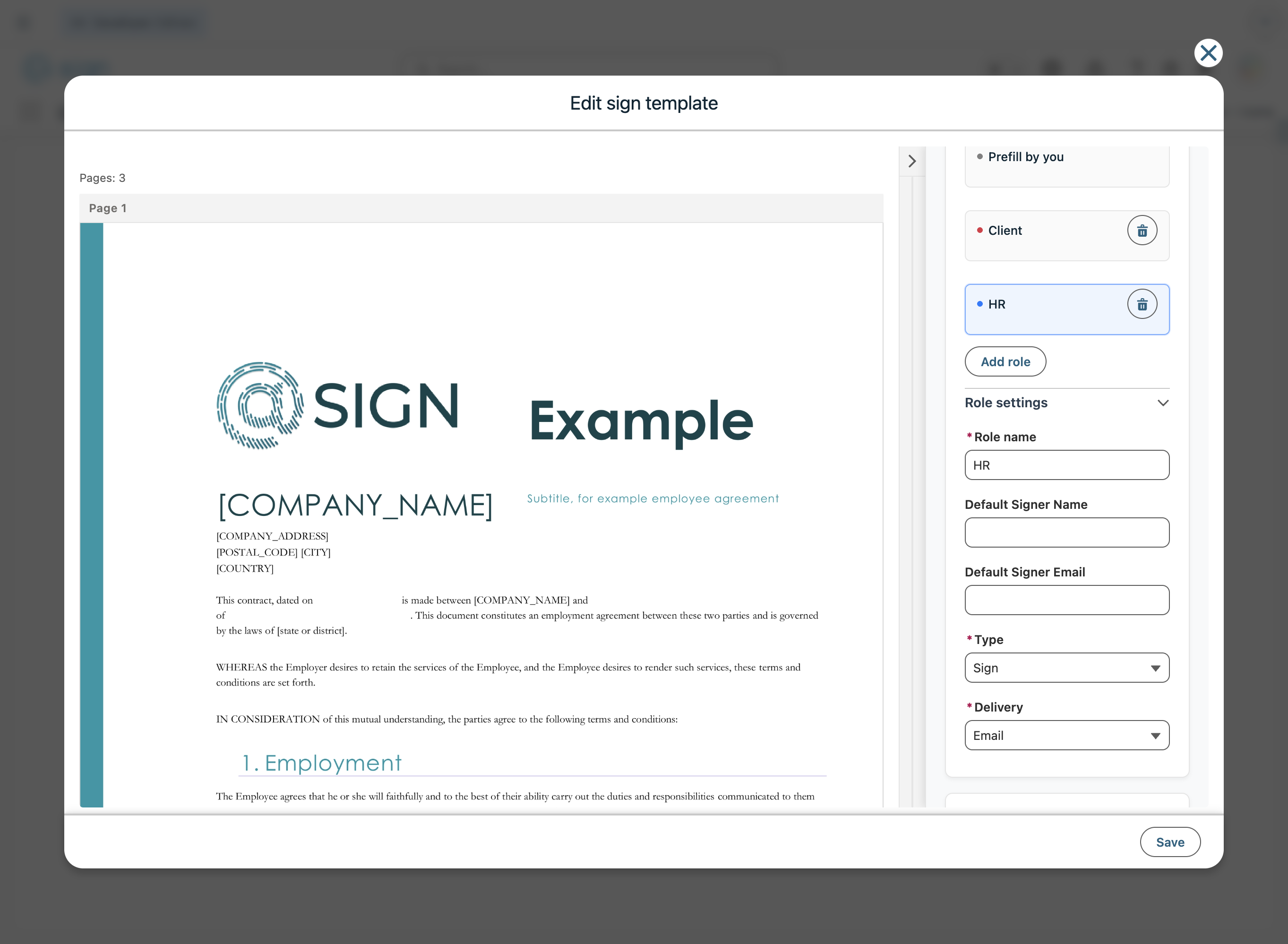 Under the role settings, you need to fill out the details of the role. The role name is for internal purposes, so you can identify the signer. You can set a default name and email for this person. The type defines what this person has to do, sign, approve, view, ...