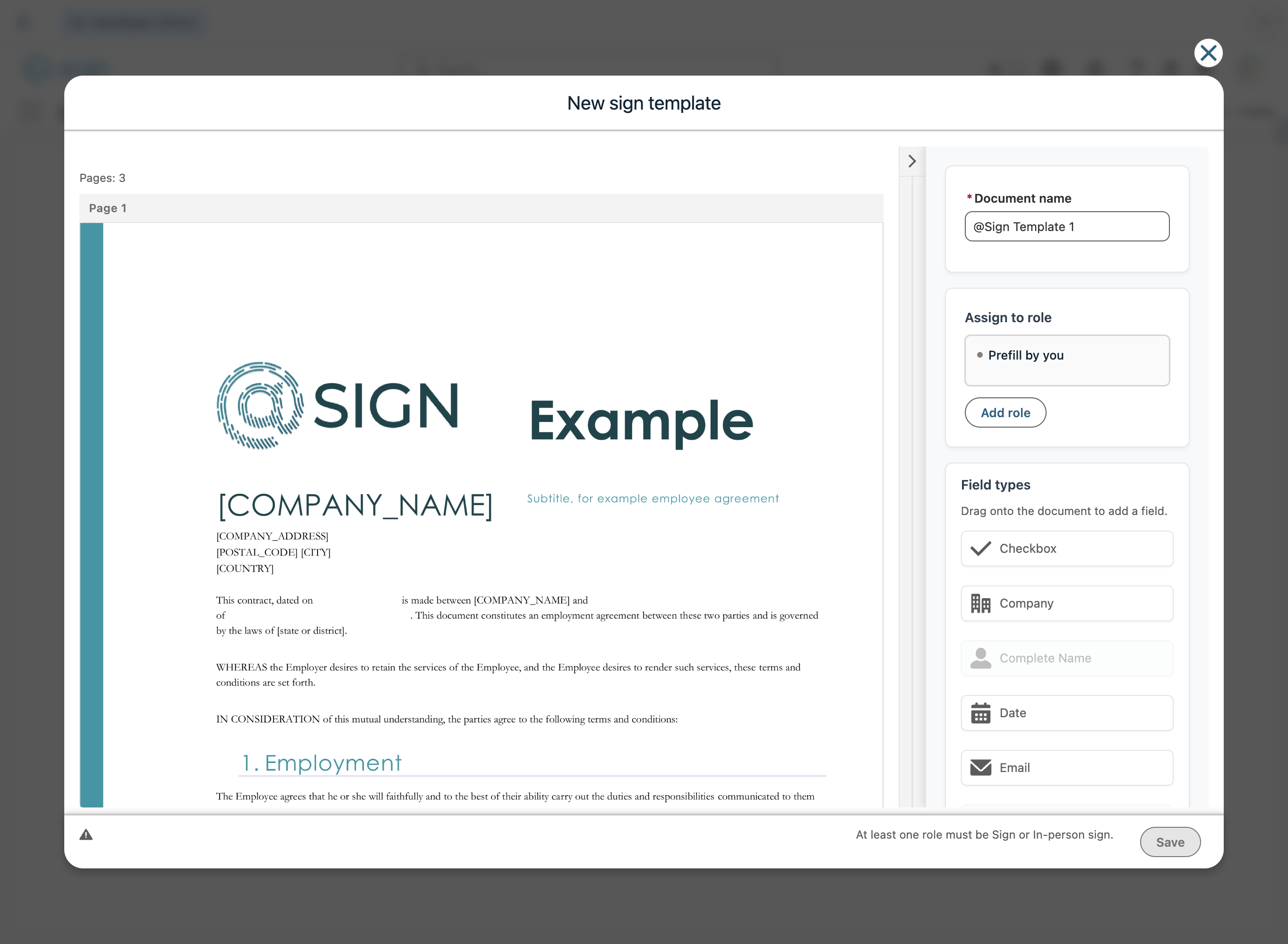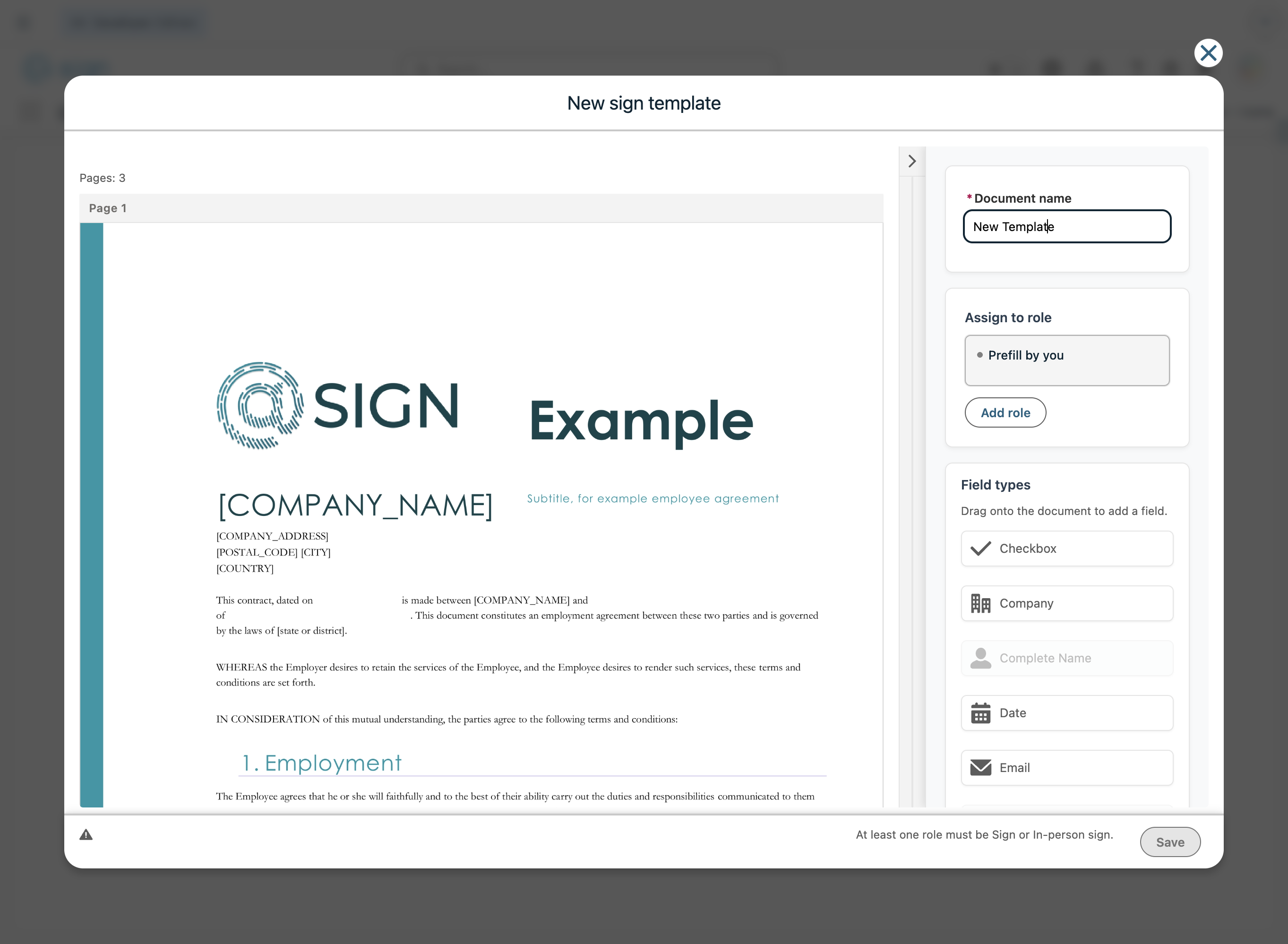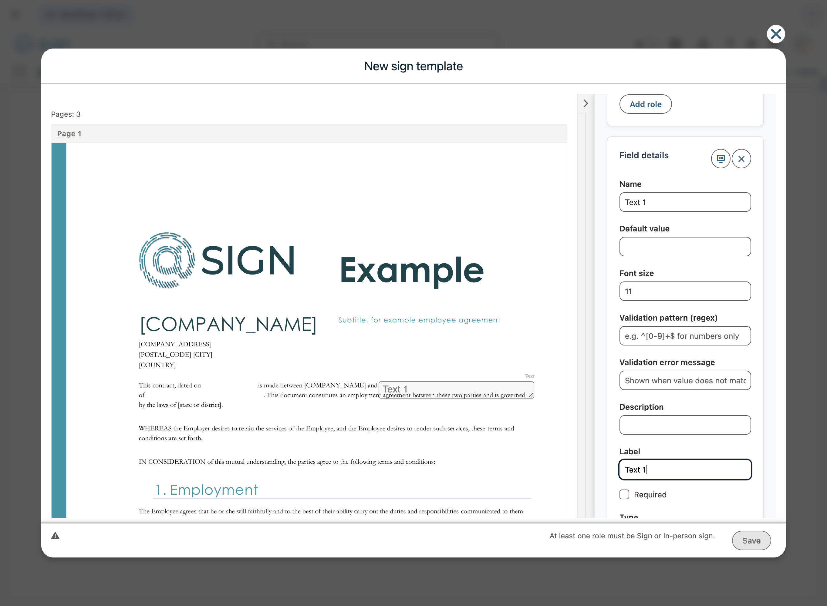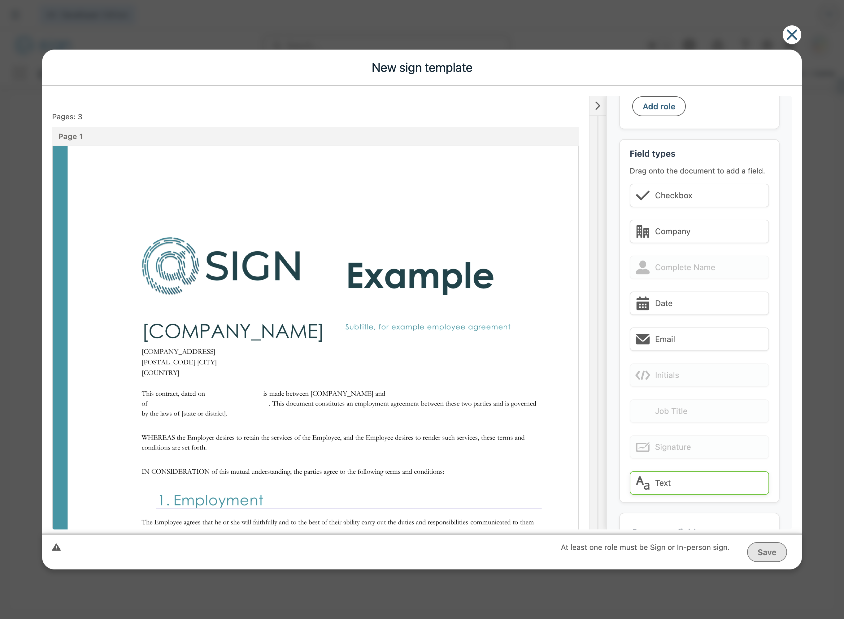 To create a new field, select the role in the sidebar and then you can drag and drop fields on the document. You can add additional roles by using the "Add role" button.