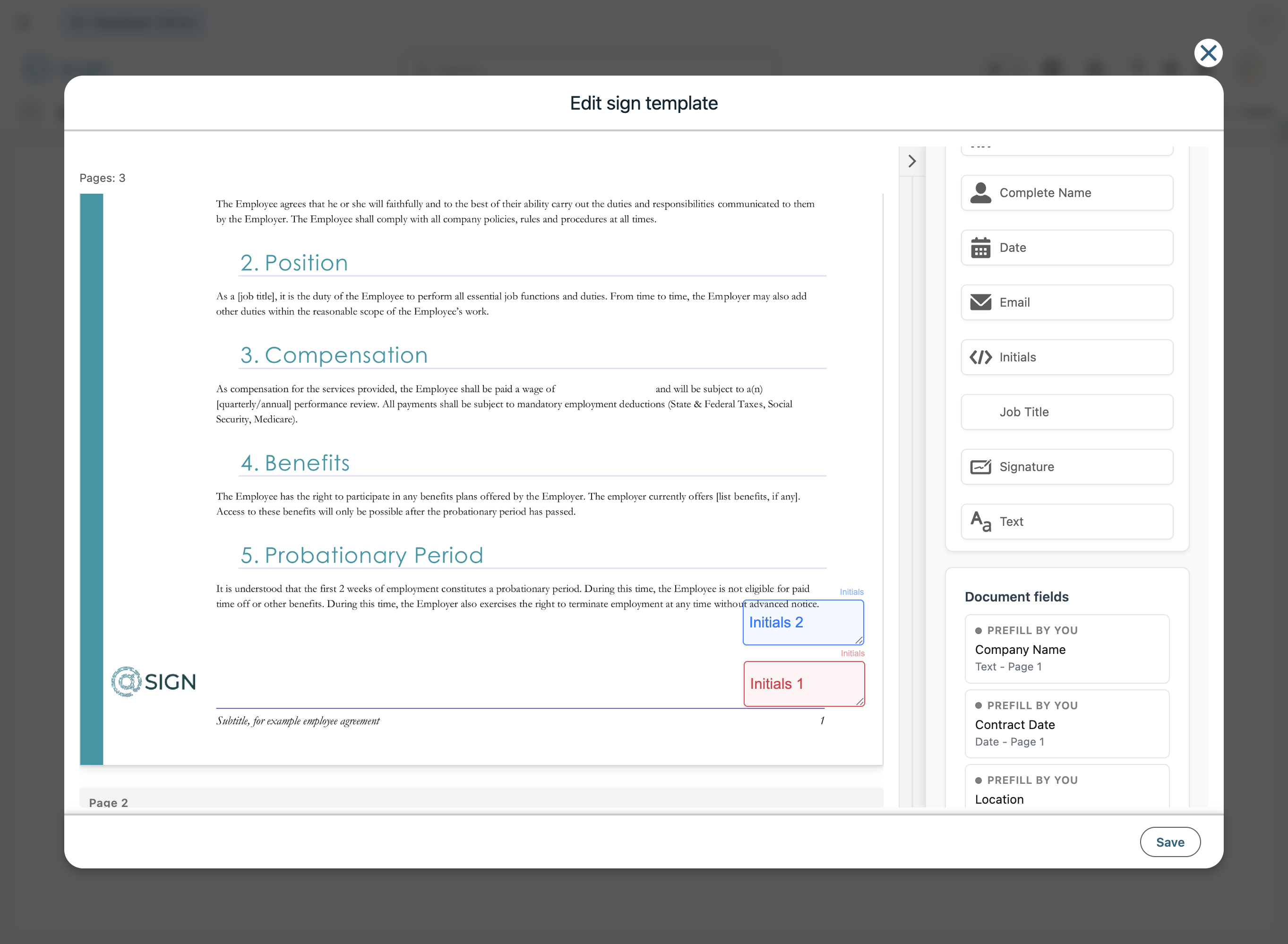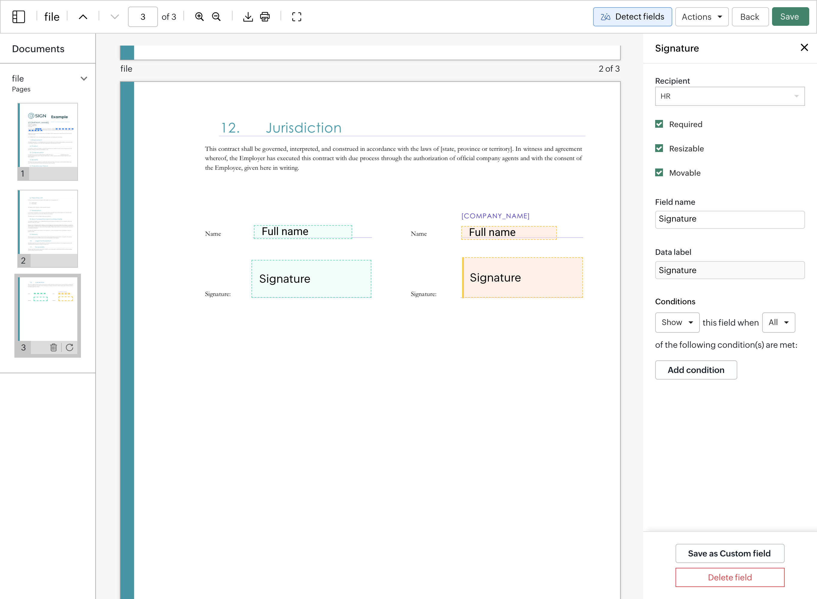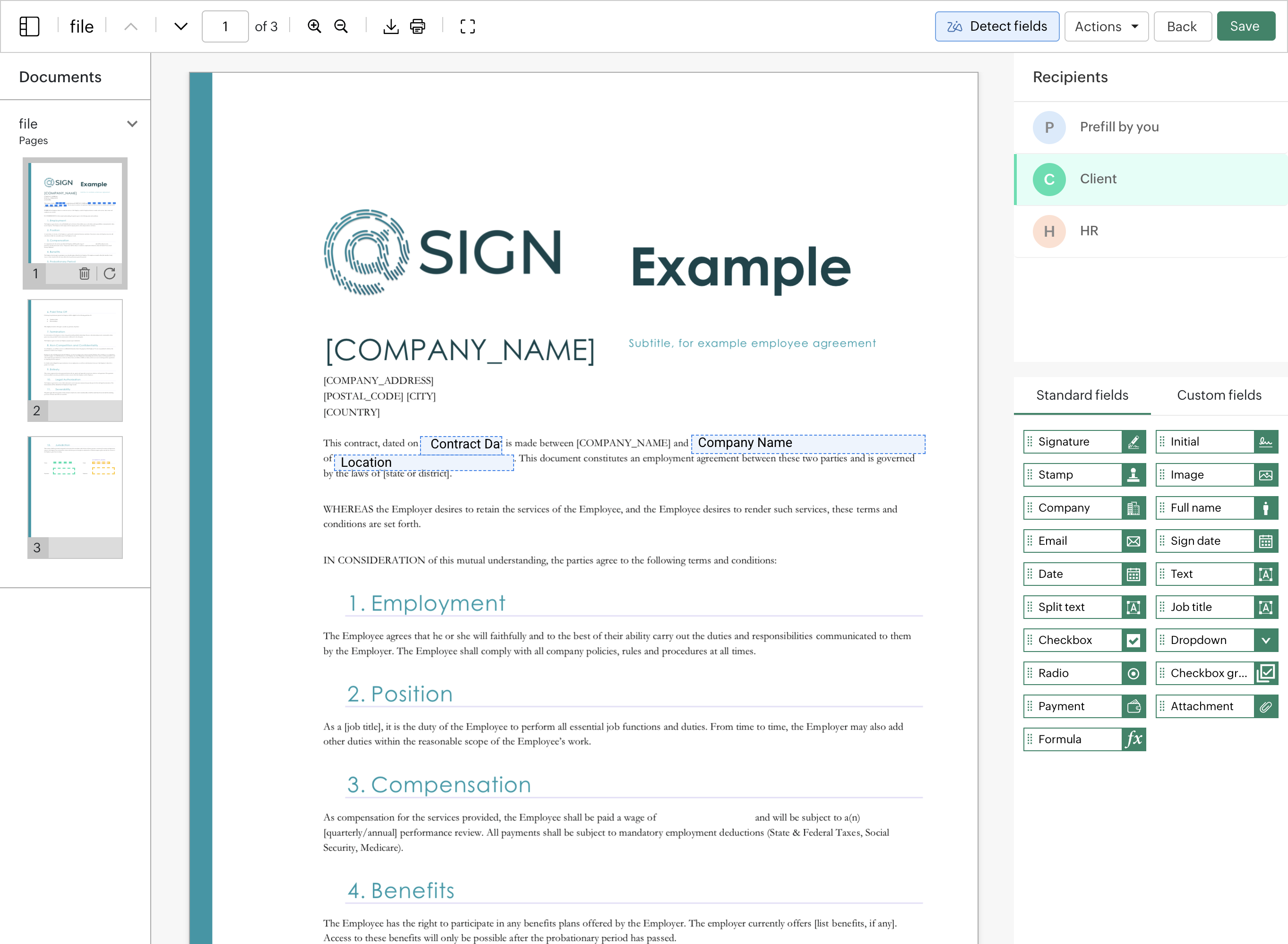 Now you can create fields for the specific roles, each role gets a color and the field will appear in the color of the role. At the bottom of the sidebar you can find an overview of all the fields in the document. Click on the card, to navigate to that field.