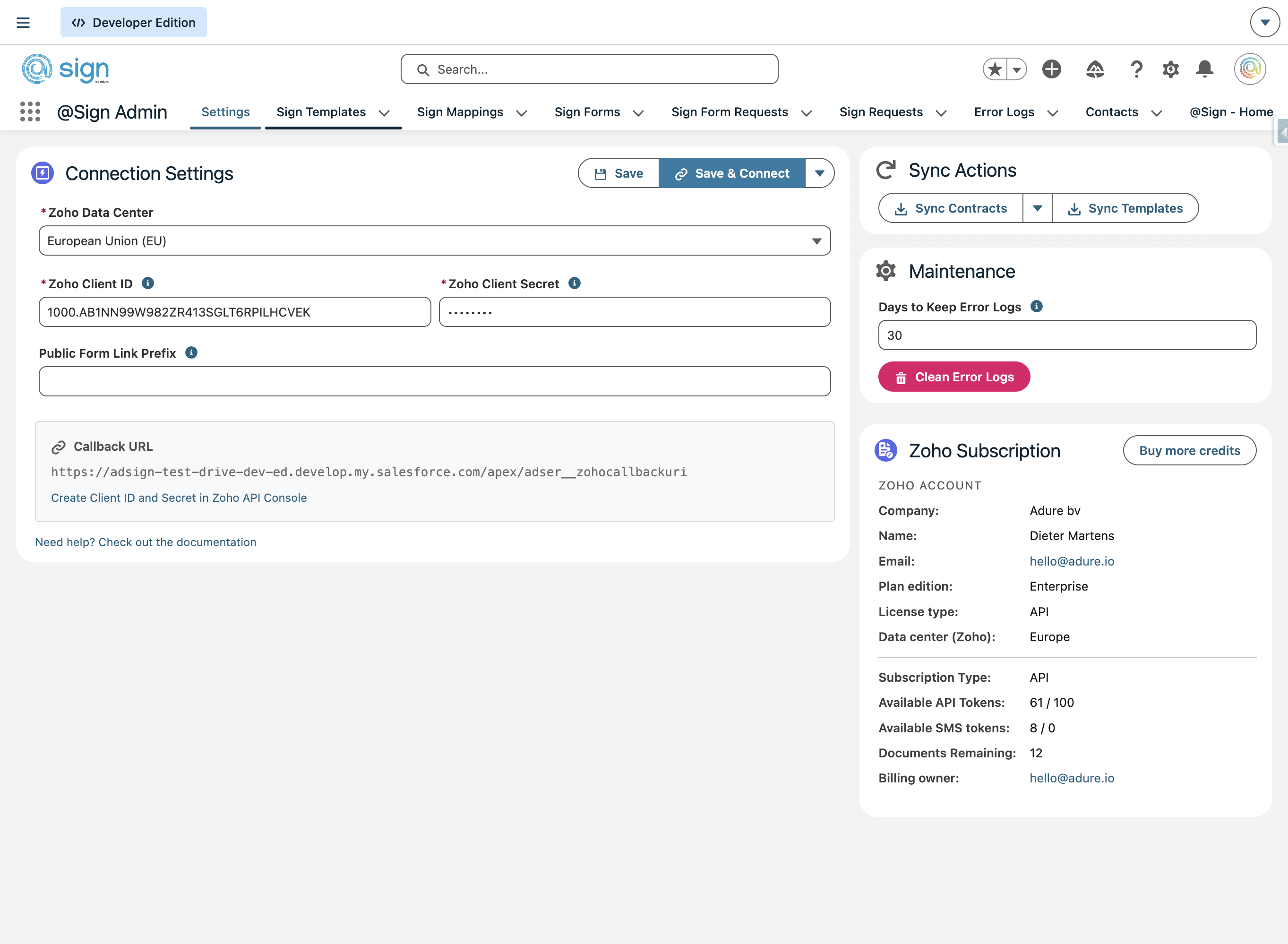 The @Sign integration provides a powerful internal editor that allows you to manage Zoho Sign templates directly within Salesforce. While you can still use the native Zoho Sign interface for legacy documents, our built-in editor streamlines your workflow by keeping document design and CRM data in one place.